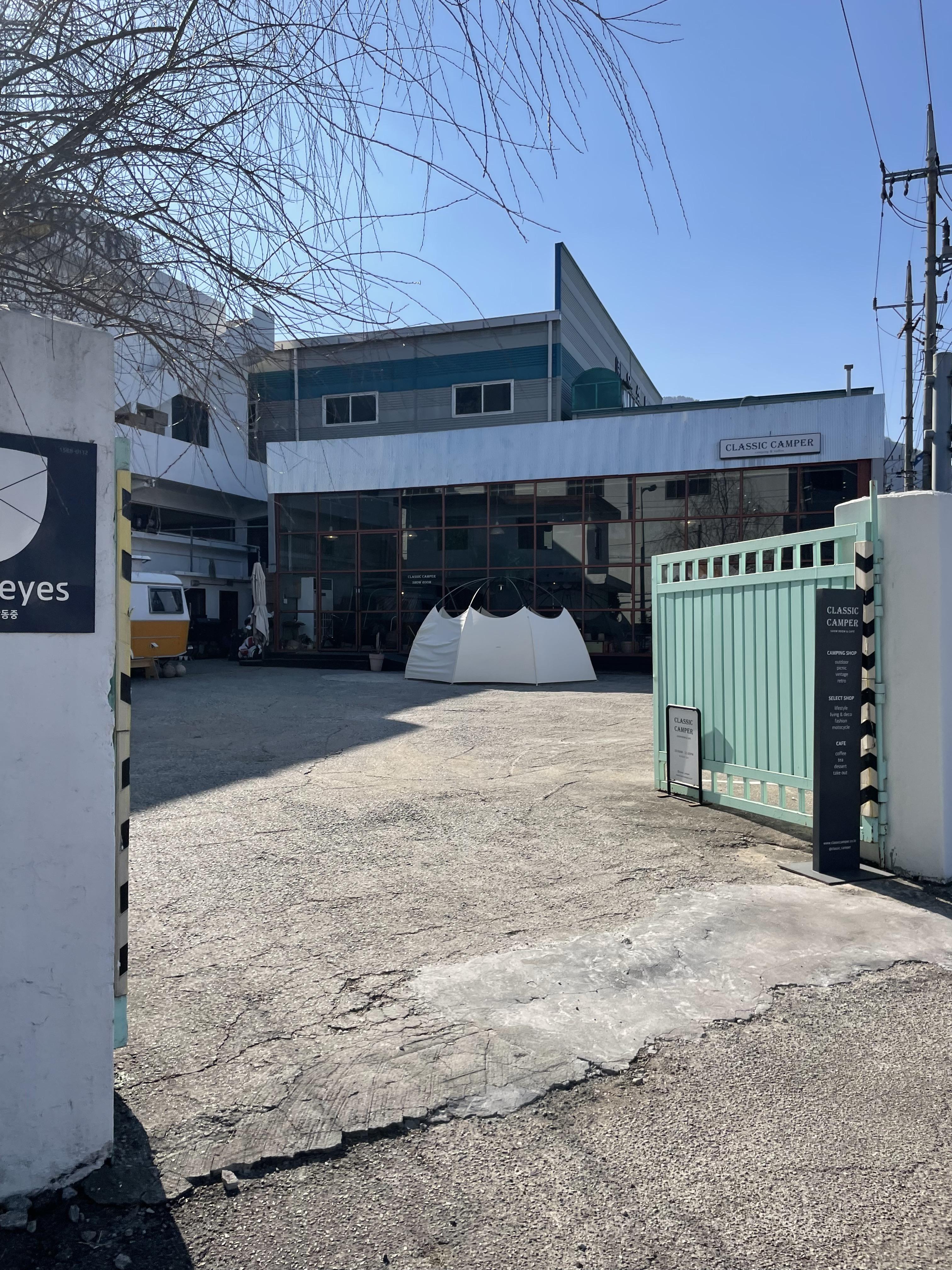 정면에 위치한 건물에는 캠핑용품 판매하고 있어요!